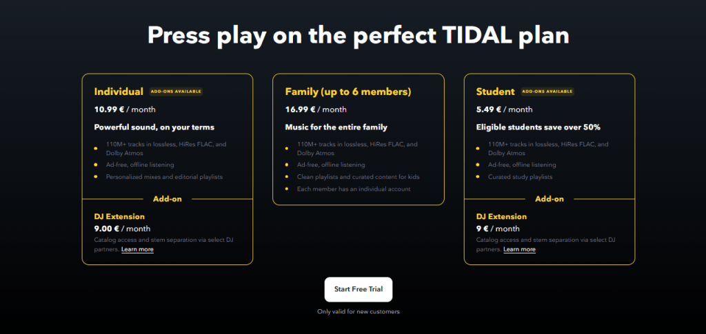 This could be a deciding factor if you plan to share your account. Another option, available only on TIDAL, is an extension specifically designed for DJs, priced at an additional $9 per month on individual and student plans. This allows them to cater to a broad audience and, once again, position themselves as a platform designed for audio professionals. However, be aware that YouTube Music Premium stands out from competitors in its trial period.